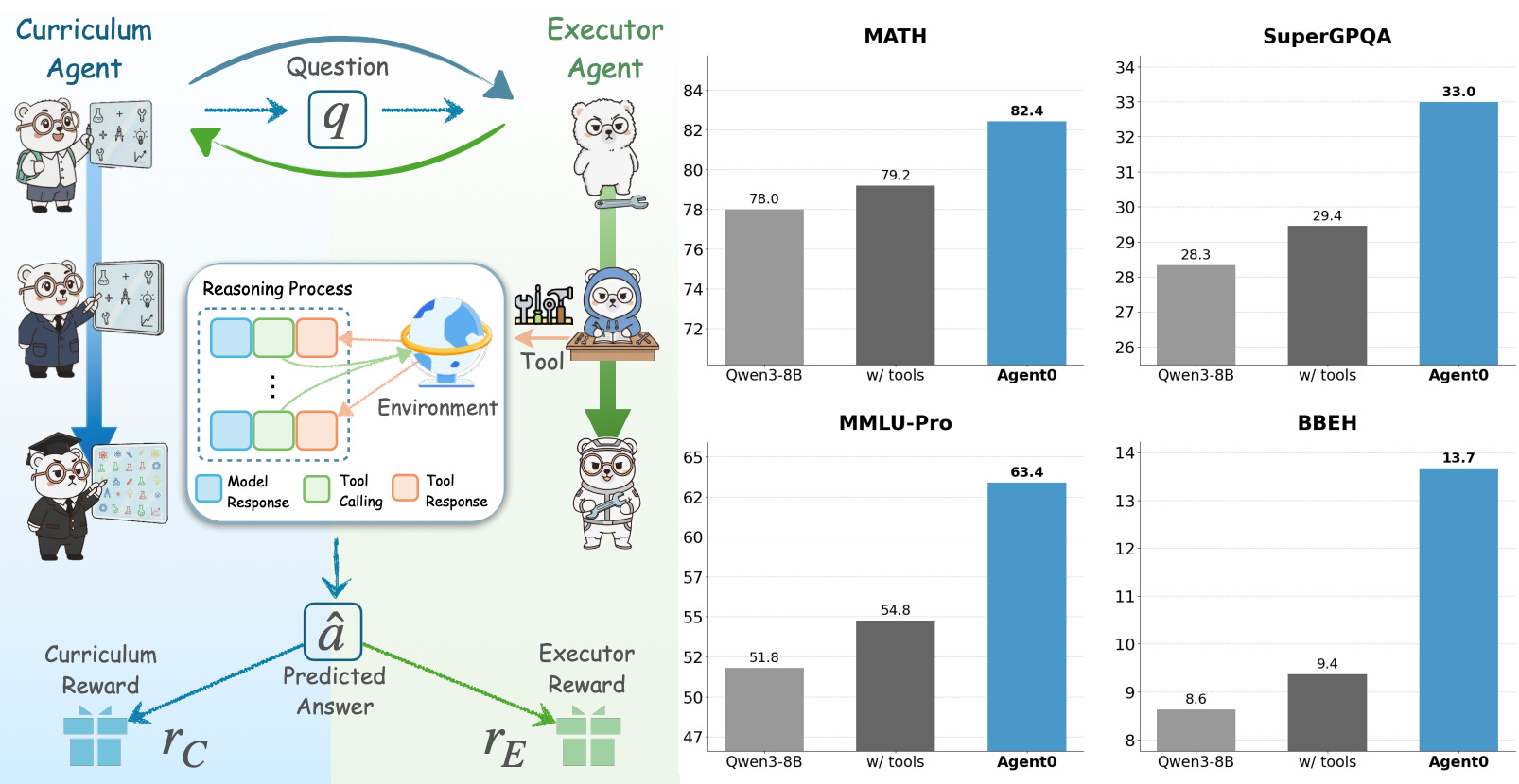 Training AI agents typically requires massive amounts of human-curated data, limiting both scalability and capabilities to what humans already know. Agent0 breaks this dependency through symbiotic competition between two agents: a curriculum agent that proposes increasingly complex tasks, and an executor agent that learns to solve them using external tools. The key insight is giving agents access to tools like Python interpreters, which provides problem-solving capabilities beyond the base model. This self-reinforcing cycle improved Qwen3-8B-Base by 18% on mathematical reasoning and 24% on general reasoning benchmarks, entirely without external training data.