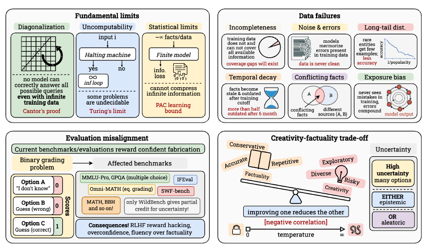 Large language models have improved dramatically with scale, but these gains face five fundamental limitations: hallucination, context compression, reasoning degradation, retrieval fragility, and multimodal misalignment. This paper provides a rigorous theoretical framework showing these aren’t engineering problems to be solved through more compute. Computability theory guarantees that for any model family, diagonalization ensures inputs where models must fail. Finite description length enforces irreducible generalization error. Long context windows compress far below their nominal size due to positional under-training and attention mechanics. The work establishes mathematical boundaries for where scaling helps, where it saturates, and where it provably cannot progress.