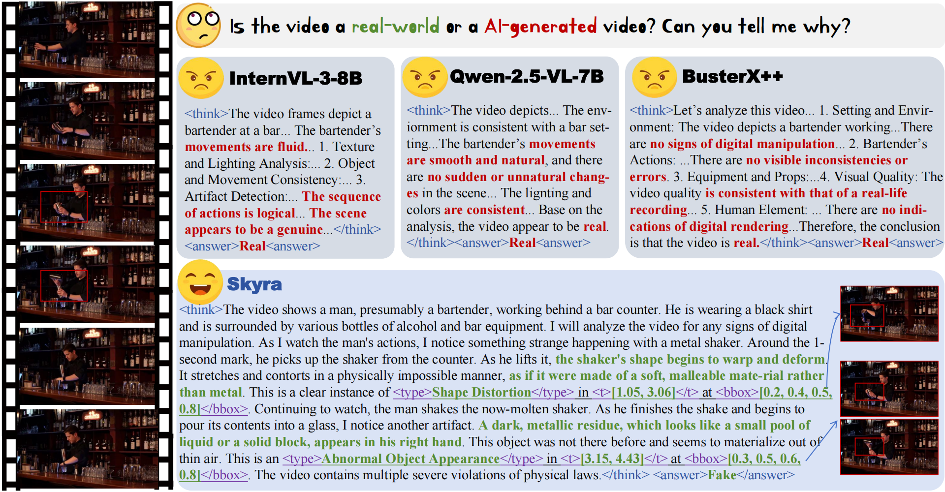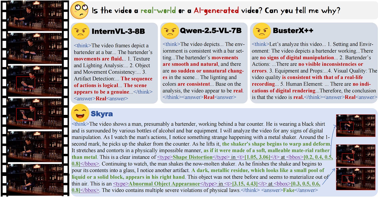 AI video detection just got explainable. Skyra identifies specific visual artifacts in AI-generated videos and uses them as grounded evidence for both detection and explanation. The model introduces ViF-CoT-4K, the first large-scale dataset of AI-generated video artifacts with fine-grained human annotations. Instead of just saying “this is fake,” Skyra points to concrete inconsistencies like shape distortions or camera motion problems. The two-stage training strategy enhances spatio-temporal artifact perception while maintaining explainability. Tested against outputs from over ten state-of-the-art generators on the new ViF-Bench benchmark, Skyra outperforms existing methods while actually showing you why it reached its conclusion.