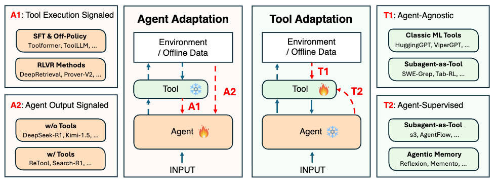 A systematic framework for understanding adaptation in agentic AI systems. The paper unifies the expanding research landscape into agent adaptations (tool-execution-signaled and agent-output-signaled) and tool adaptations (agent-agnostic and agent-supervised). This framework clarifies the design space of adaptation strategies, makes trade-offs explicit, and provides practical guidance for selecting or switching among strategies during system design. The comprehensive survey reviews representative approaches in each category, analyzes strengths and limitations, and highlights key open challenges for building more capable and reliable agentic systems.