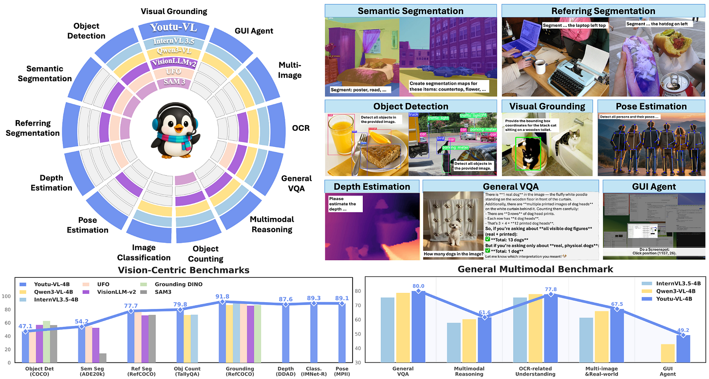 Vision-language models exhibit a text-dominant optimization bias by treating visual signals as passive inputs rather than supervisory targets. Youtu-VL shifts to the Vision-Language Unified Autoregressive Supervision paradigm, integrating visual tokens directly into the prediction stream and applying unified autoregressive supervision to both visual details and linguistic content. This “vision-as-target” approach fundamentally changes optimization from treating vision as conditional input to making it a prediction objective. The framework extends to vision-centric tasks without requiring task-specific architectural additions, establishing foundations for comprehensive generalist visual agents.