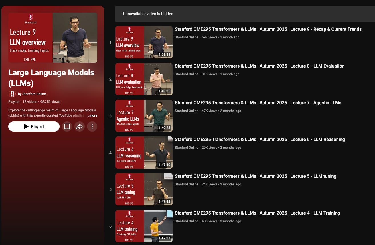 Stanford’s curated playlist brings together lectures from multiple courses covering large language models, including CS224N (NLP with Deep Learning), CS25 (Transformers United), and CME 295 (Transformers & Large Language Models). The collection spans foundational concepts in transformer architectures and training methodologies alongside cutting-edge developments in reasoning models, multimodal systems, and efficient inference techniques.