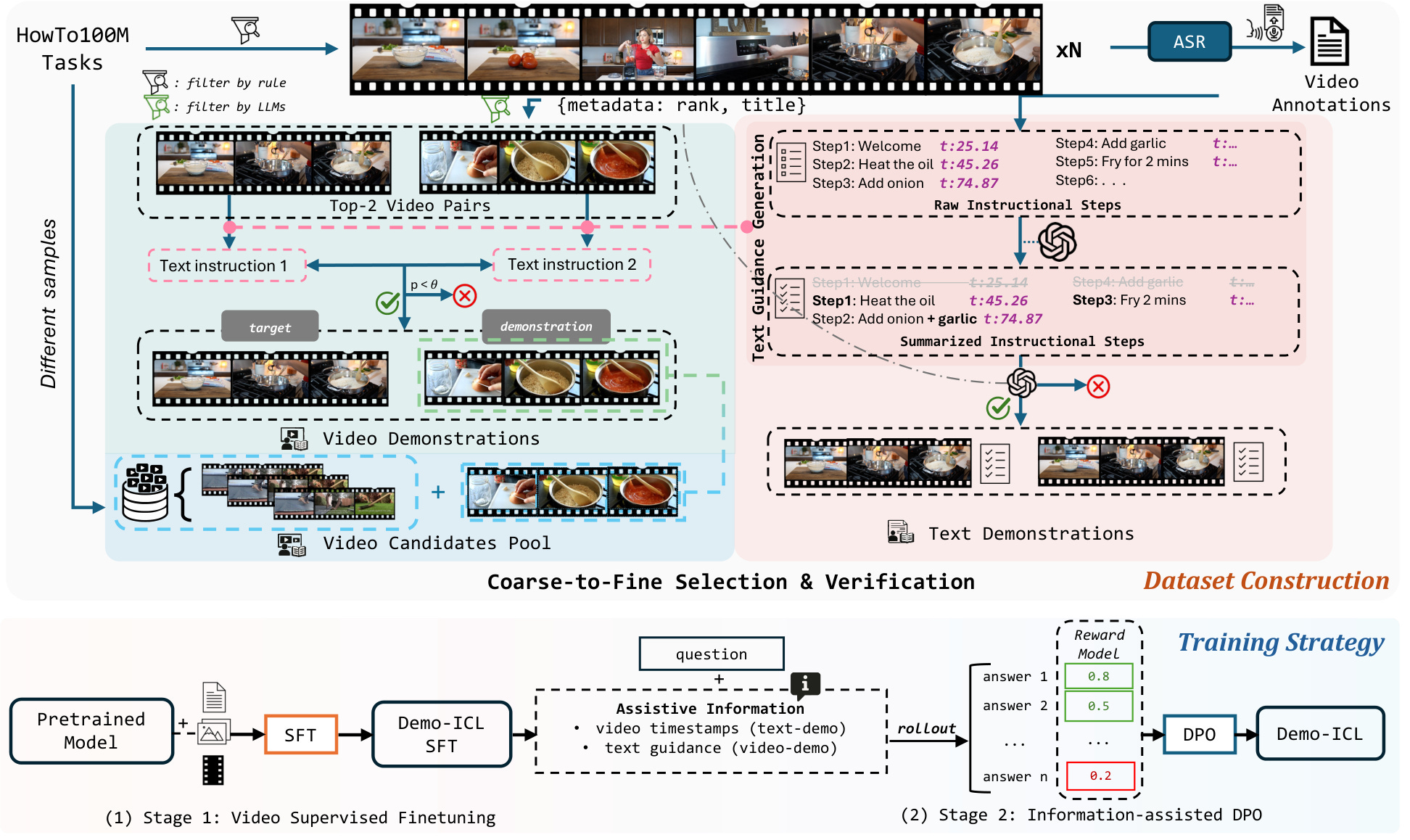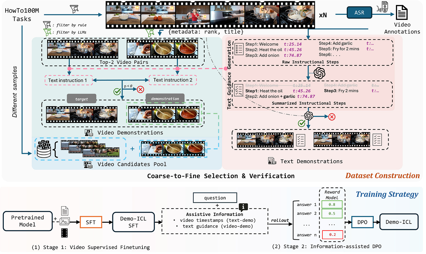 Most video benchmarks test static knowledge rather than whether models can actually learn from demonstrations. Demo-ICL tackles this directly with a benchmark built from 1200 instructional YouTube videos. The system provides models with text or video demonstrations, then asks them to answer questions about target videos by applying what they learned from the examples. The two-stage training approach combines video-supervised fine-tuning with information-assisted preference optimization, improving how models extract and apply procedural knowledge from demonstrations.