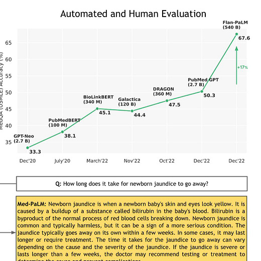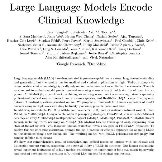 When they evaluated the instruction-tuned variant PaLM (a 540 billion parameters LLM), Flan-PaLM, on this benchmark, they found that it achieved state-of-the-art results. But, it failed on the human evaluation framework they proposed. To fix this, they created a new variant Med-PaLM using a parameter efficient approach. This performed much better, but, is still inferior to clinicians.